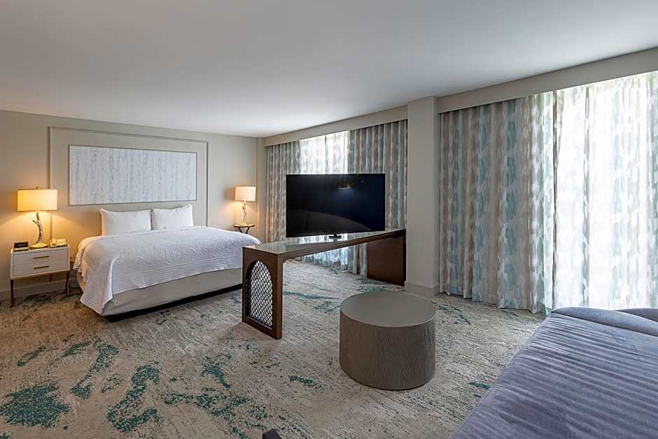 This room features a flat-screen cable TV, desk, safe, and coffee-making facilities. The marble-tiled bathroom includes a hairdryer and bathrobes.